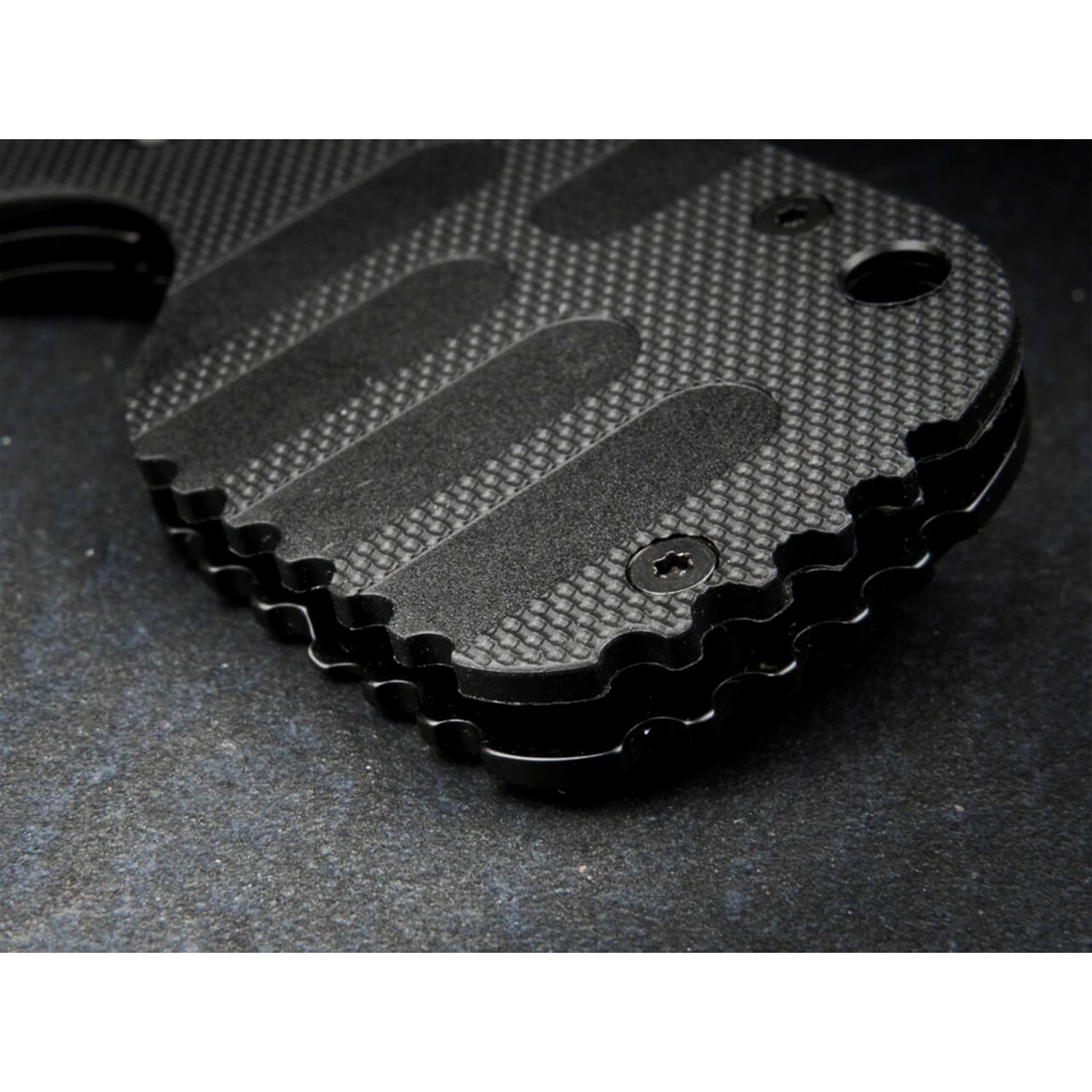 Die strukturierte Griffschale aus schwarzem Zytel mit dreidimensionalen Fräsungen und ergonomischer Formgebung sorgt auch bei Nässe für sicheren Halt.