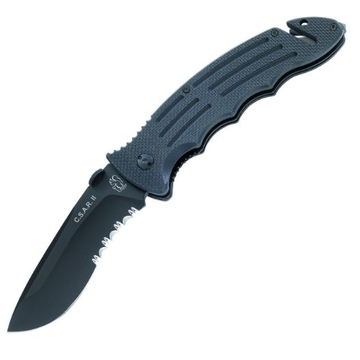 Das C.S.A.R. II ist mit einer Teilwellenschliffklinge ausgestattet, die nicht nur Schneidarbeiten erleichtert, sondern auch beim Durchtrennen von Seilen oder anderen Materialien hervorragende Dienste leistet. Der ergonomisch gestaltete Griff mit rutschfesten G10-Beschalungen sorgt für sicheren Halt und optimale Kontrolle, selbst bei Nässe oder widrigen Witterungsbedingungen.