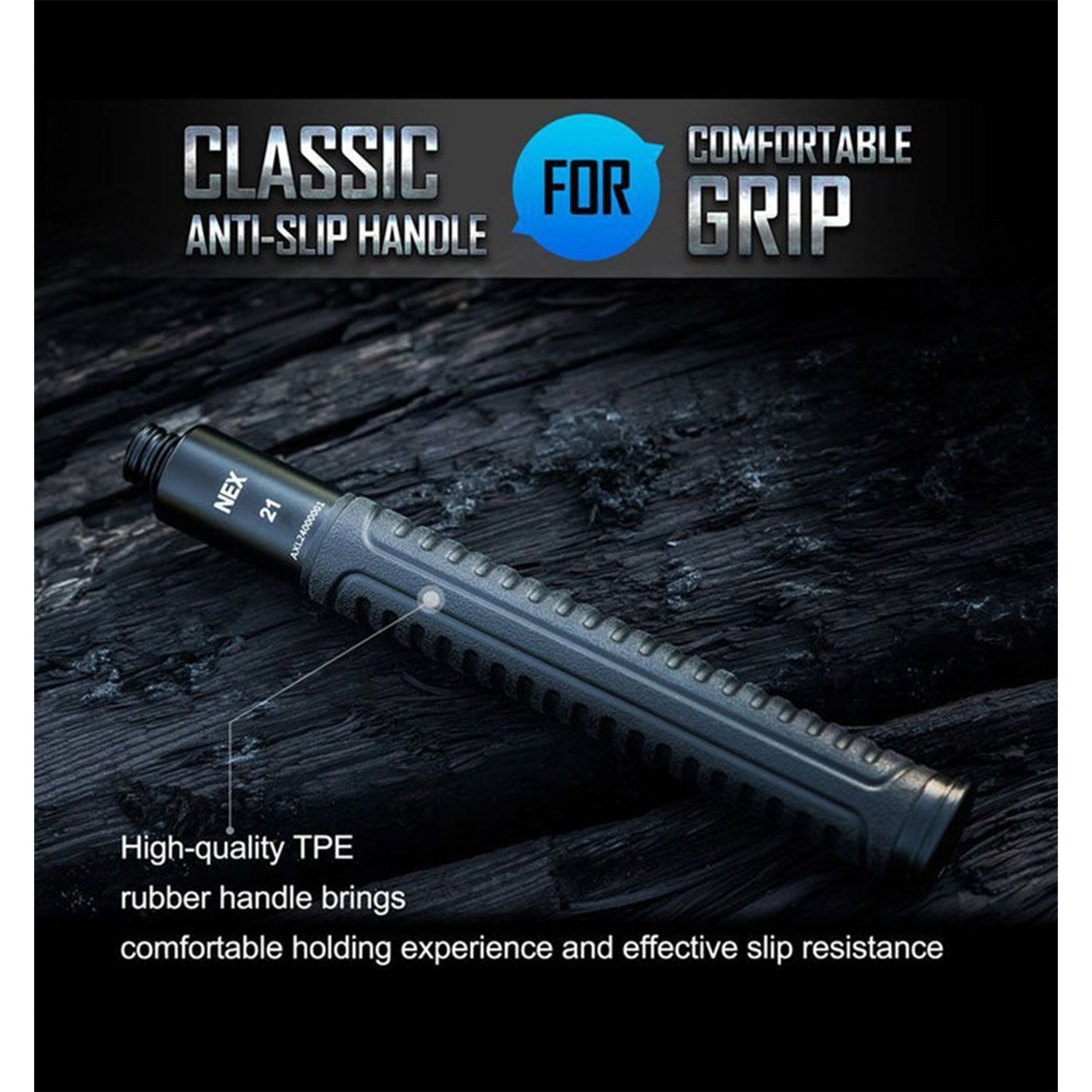 Hergestellt aus einer Kombination von 42CrMo und 7075er Aluminiumlegierung, überzeugt der Nextorch Nex Baton mit einer robusten Materialbeschaffenheit, die hohe Stabilität und Langlebigkeit gewährleistet. Mit Thermoplastischen Elastomeren (TPE) ausgestatteter Griff sorgt dafür, dass der Baton auch unter widrigen Bedingungen stets sicher in der Hand liegt.