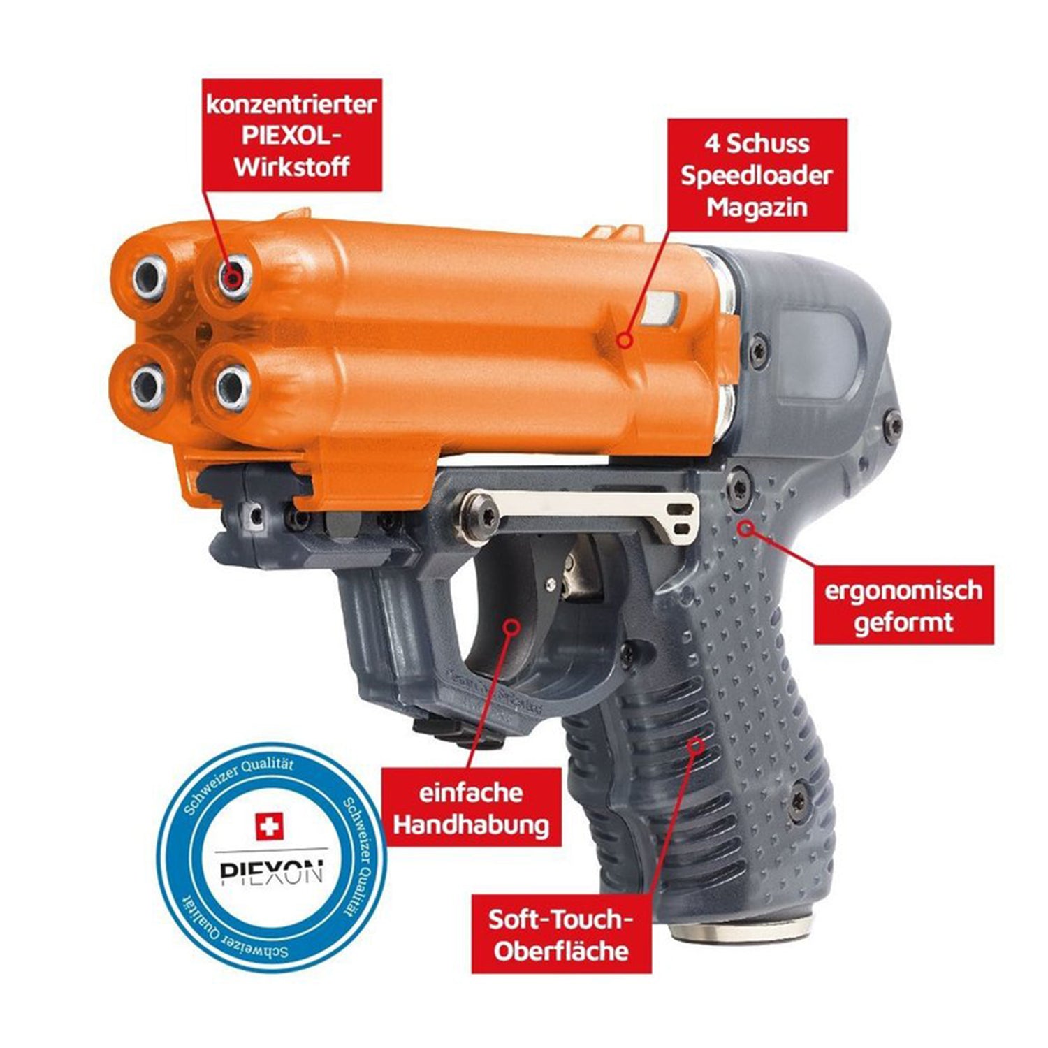 Pfefferspray Abschussgerät Jet Protector JPX6 mit Laser kombiniert höchste Effizienz und einfache Handhabung, ideal für Sicherheitskräfte. Dieses innovative Gerät aus der Schweiz überzeugt durch ein 4-Schuss-Speedloader-Magazin, das eine automatische Nachladung ermöglicht. Der JPX6 bietet die gleiche überragende Reichweite und Abschussgeschwindigkeit wie sein Vorgängermodell JPX2 und beschleunigt den hochwirksamen PIEXOL-Wirkstoff mithilfe einer Treibladung auf bis zu 290 km/h. Durch die Soft-Touch-Oberfläche liegt die Pfefferspray-Pistole besonders gut in der Hand. Dank der integrierten Laser-Zielhilfe können Ziele in größerer Distanz präzise getroffen werden. Ein Magazinewechsel erfolgt in wenigen Sekunden und ohne Gefahr für den Nutzer.