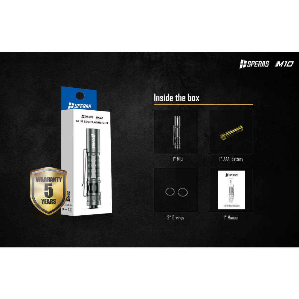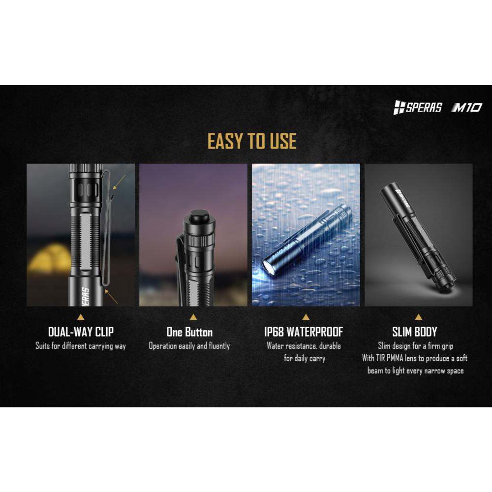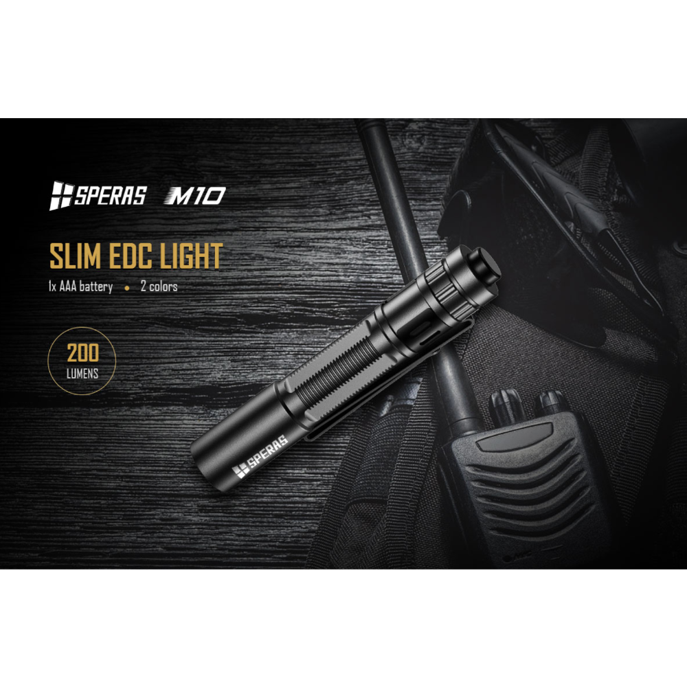 Die Speras M10 Taschenlampe ist einfach zu bedienen, mit einem intuitiven Schalter, der einen schnellen Zugriff auf verschiedene Beleuchtungsmodi ermöglicht. Sie ist leicht und kompakt, was sie zu einem praktischen Begleiter für jede Mission macht.
