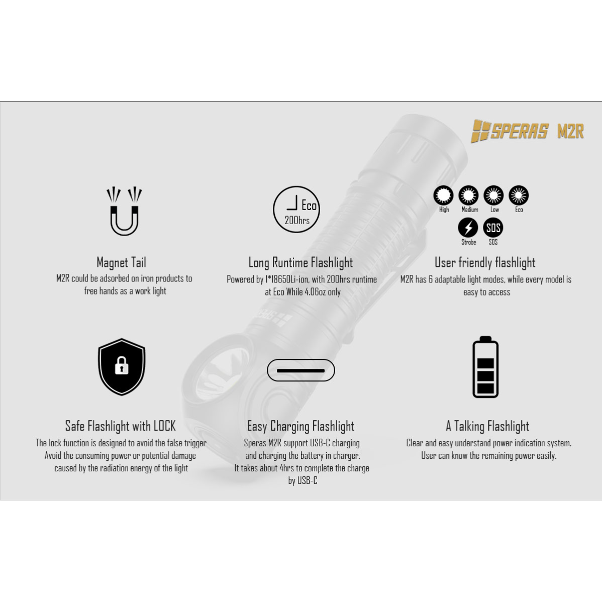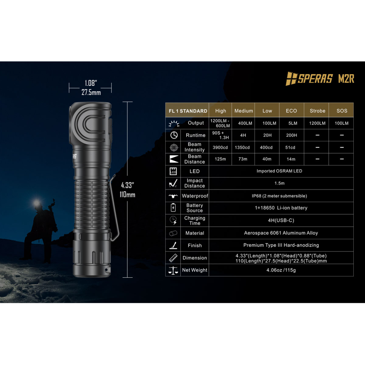 Die Speras M2R Taschenlampe ist nicht nur für den privaten Gebrauch, sondern auch für den professionellen Einsatz bei Sicherheitskräften und Outdoor-Enthusiasten geeignet. Ihre robuste Konstruktion und hohe Leistung machen sie zu einem unverzichtbaren Werkzeug in jeder Ausrüstung.