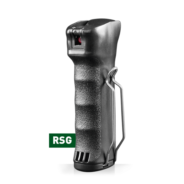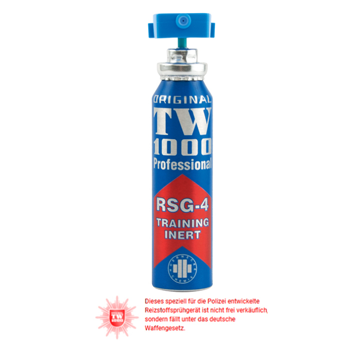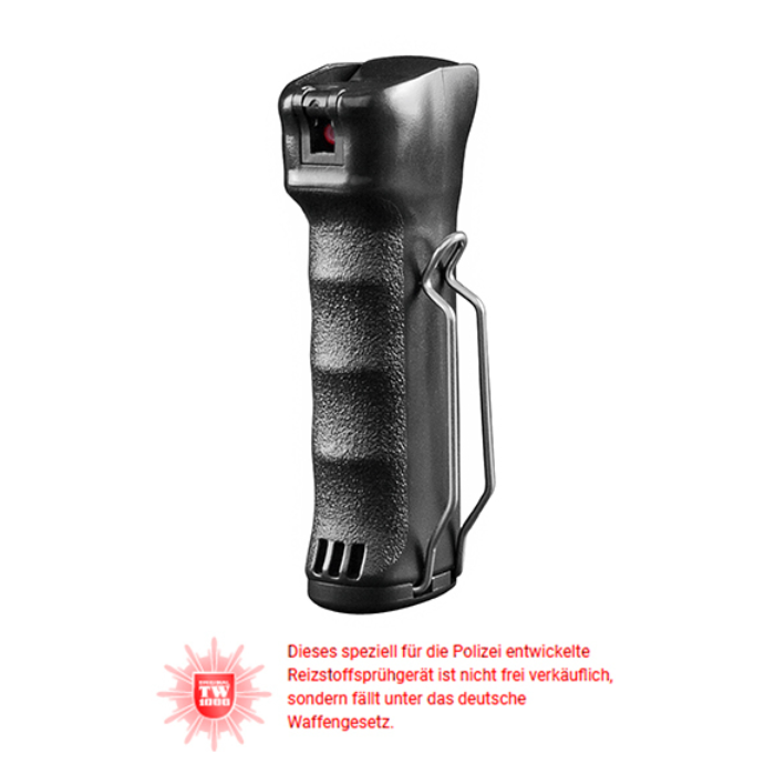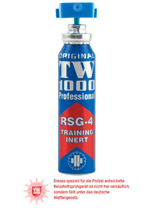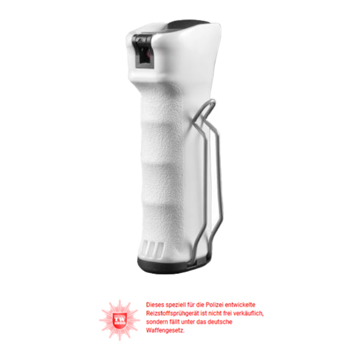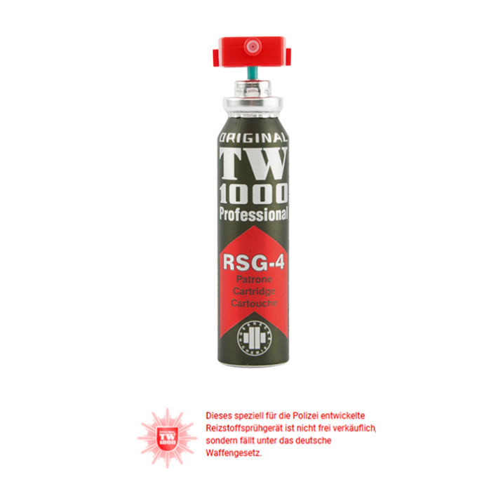 TW1000 RSG-4 ist ein bewährtes Reizstoffsprühgerät, das unter das Waffengesetz (WaffG) fällt und nur von Behörden und Ordnungsämtern mit BKA-Ausnahmegenehmigung erworben werden darf. Funktional, robust und kompakt, zeichnet sich dieses Gerät durch zahlreiche praktische Elemente aus. Das Gehäuse aus ABS-Kunststoff bietet hohe Schlagzähigkeit und nahezu Unverwüstlichkeit. Der Bügel ist durch eine Bodenplatte gesichert und für Rechts- oder Linkshänder umsteckbar. Mit einem Griff löst der Träger das Gerät aus der stabilen Federstahl-Aufhängung und hat es startklar in der Hand. Der federunterstützte Deckel sichert die breite Auslösetaste und macht das Gerät absolut sicher im Einsatz. Der Griff ist unten offen, so dass Inhalt und Verfalldatum leicht ablesbar sind. Die Spraypatronen sind schnell und einfach austauschbar und enthalten OC-Pfefferextrakt. Der Inhalt reicht für bis zu 14 halbsekündige Sprühstöße mit einem zielgenauen ballistischen Flüssigstrahl.