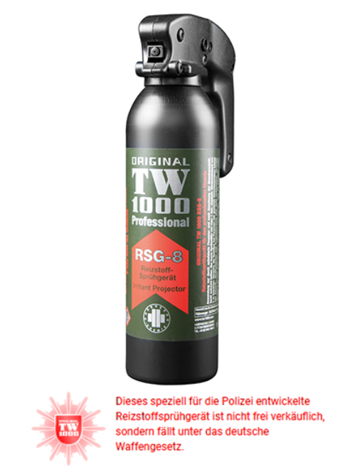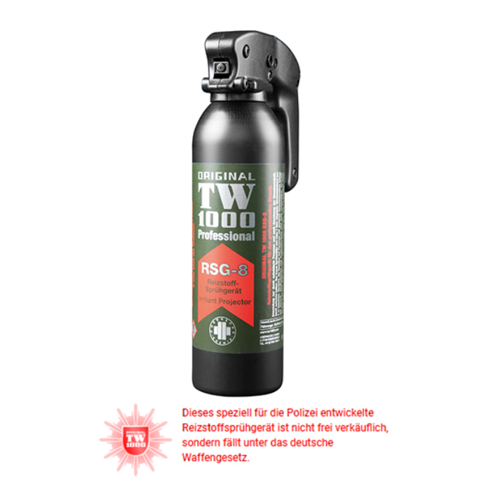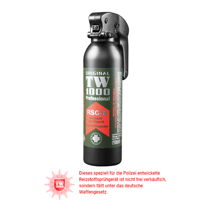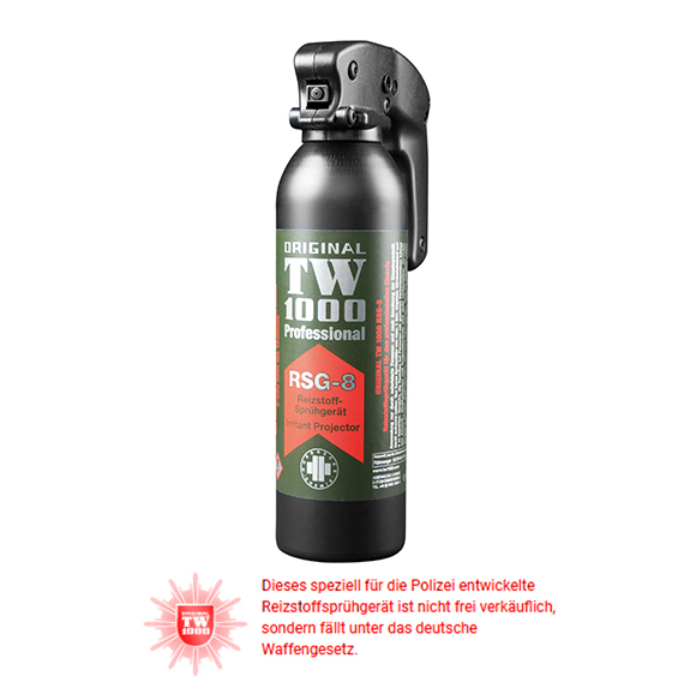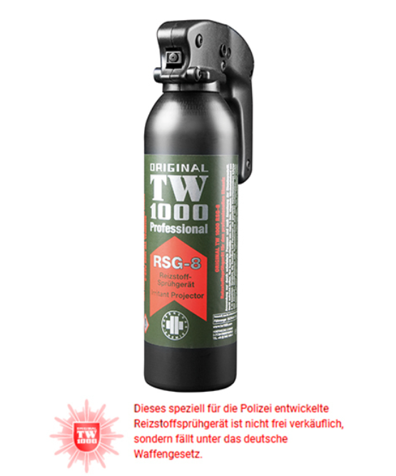 TW1000 RSG-8 ist ein professionelles Reizstoffsprühgerät, das speziell für den Einsatz durch Behörden und Ordnungsämter entwickelt wurde. Mit einer großen Reichweite bietet dieses Abwehrsystem eine zuverlässige Schutzwirkung. Es enthält 400 Milliliter des hochwirksamen OC-Pfefferextrakts, welcher aus natürlichen Chili-Extrakten hergestellt wird, oder alternativ PAVA, einem synthetisch hergestellten, capsaicin-ähnlichen Stoff. Das Gerät zeichnet sich durch seine hohe Wirksamkeit und die einfache Handhabung aus und wird sicher im Oberschenkelholster getragen. Das RSG-8 verfügt über eine Federdeckelsicherung, die ein versehentliches Auslösen verhindert und somit maximale Sicherheit bietet. Ein optischer Signalgeber zeigt an, ob das Gerät bereits benutzt wurde.