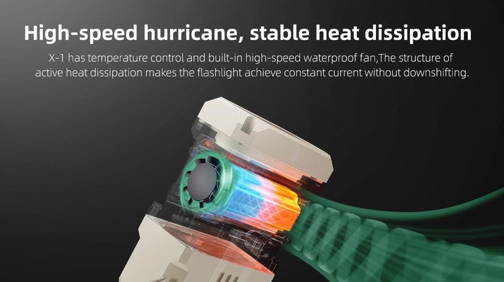 Die Wuben X-1 Falcon verfügt über ein eingebautes Kühlsystem mit wasserdichten Lüftern, das ein Überhitzen verhindert. Mit der Schutzklasse IP55 ist die Taschenlampe auch gegen Wasser geschützt und somit für den Einsatz bei schlechten Wetterbedingungen geeignet.Leistungsstarke Akkus