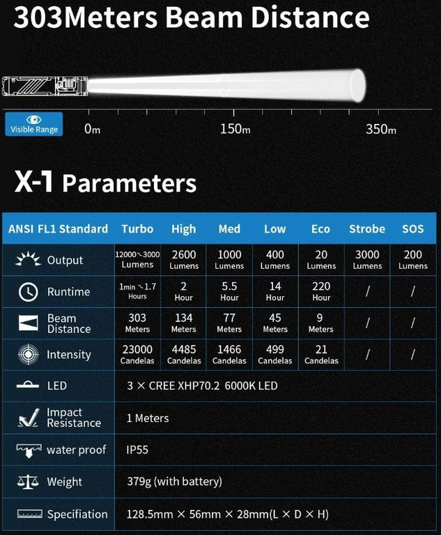 Wuben X-1 Falcon 12000 Lumen ist die ultimative Taschenlampe mit der höchsten Helligkeitsstufe, die Wuben je produziert hat. Mit einer maximalen Leistung von 12.000 Lumen und einer Reichweite von 303 Metern ist diese kompakte Taschenlampe perfekt für anspruchsvolle Einsätze geeignet. Trotz ihrer enormen Leistung bleibt die Wuben X-1 Falcon klein und handlich, mit Abmessungen von b:28 mm, h:56 mm, L:128,5 mm. Sie wiegt nur 379 g inklusive Akkus.