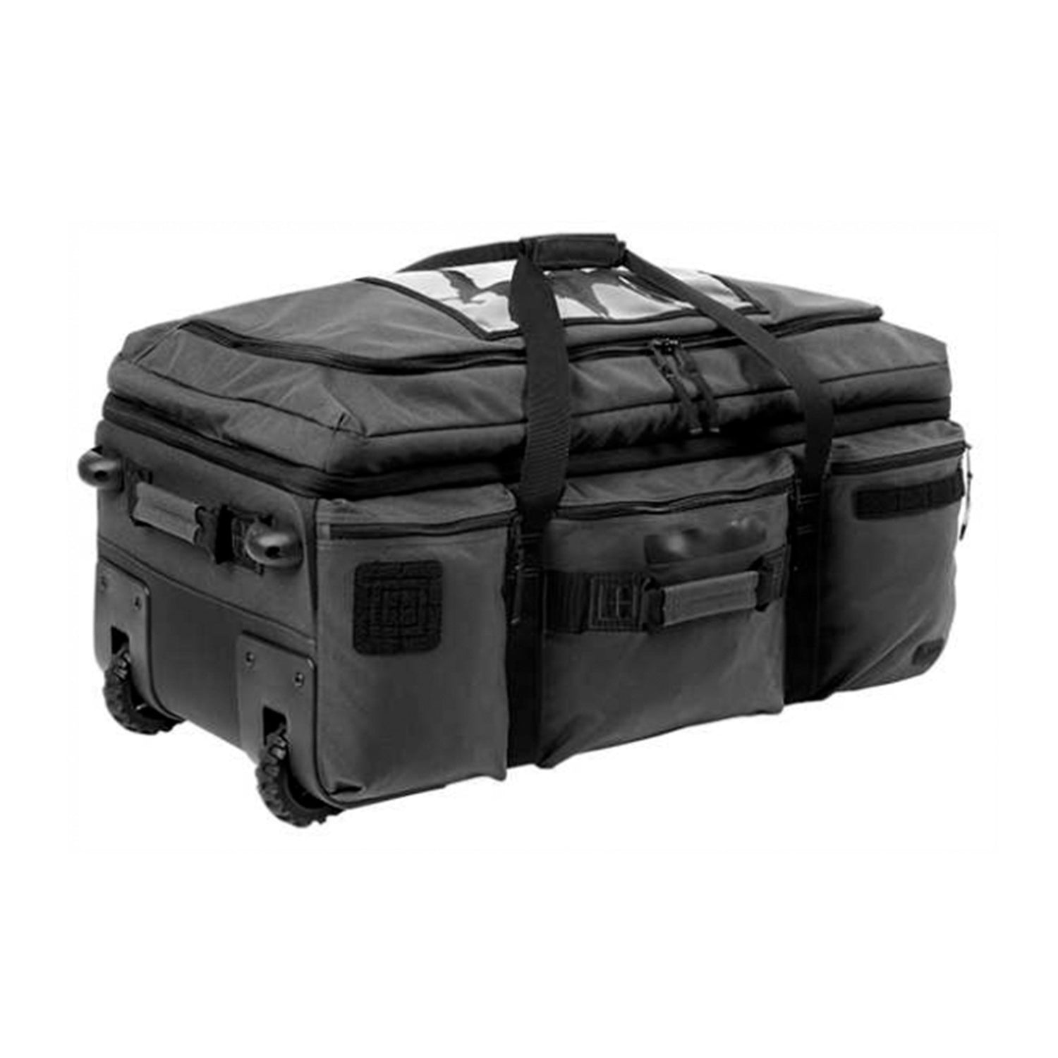 This utility bag is equipped with replaceable heavy-duty wheels, wheel housings, slide rails and edge protectors for additional stability. The retractable handle, as well as self-pulling grab handles and Velcro carrying straps, allow for easy handling. Padded carrying handles on the head and sides provide additional comfort.Additional features