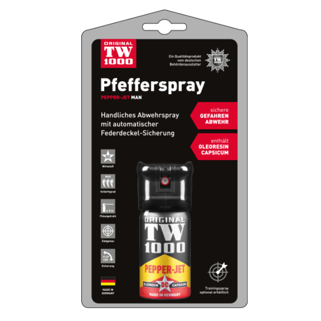 TW1000 pepper spray is approved for animal defense and offers protection against attacks by vicious dogs or dangerous animals. It has been used successfully for years in many countries as a universal defense spray. In Germany, the spray is only permitted for animal defense.