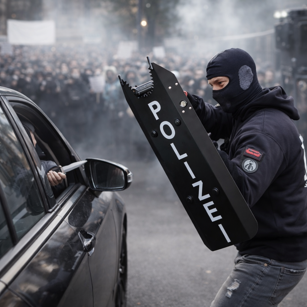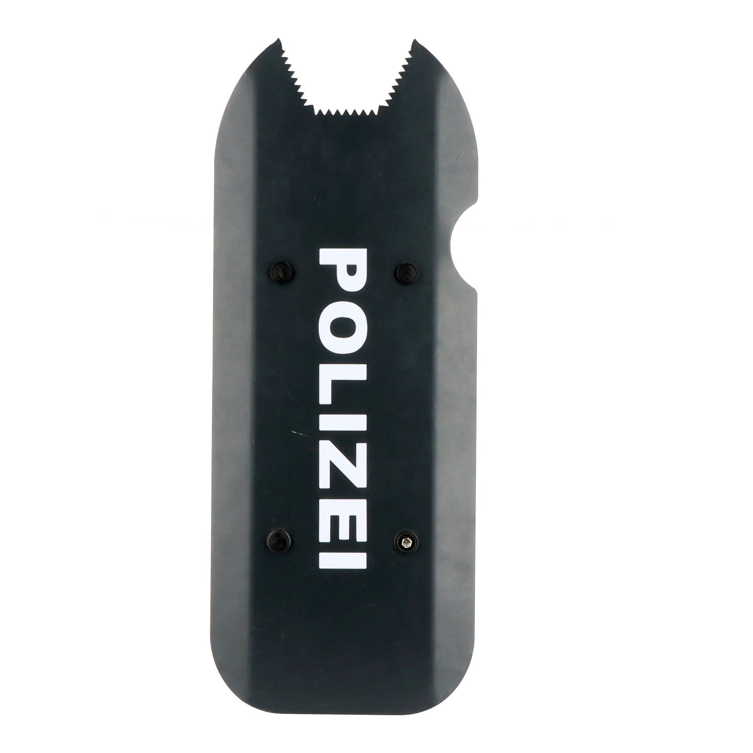 An den oberen Kanten sind zwei integrierte Fensterbrecher angebracht, die dem kontrollierten Einschlagen bzw. Öffnen von Fahrzeug- und Gebäudeverglasungen im Rahmen polizeilicher Maßnahmen dienen. Die Konstruktion ist auf einen robusten Einsatzbetrieb mit häufiger Nutzung und wechselnden Szenarios ausgelegt.
