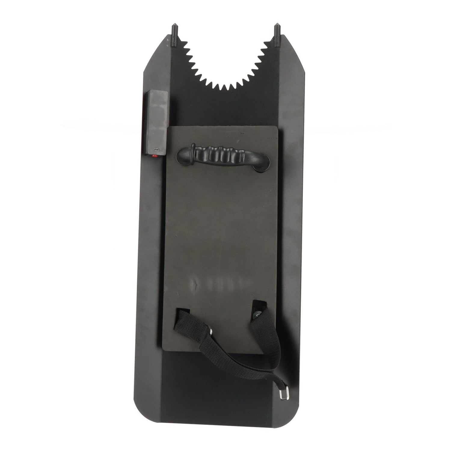 Mit einem Gesamtgewicht von ca. 1,08 kg ist das Armschild für dauerhaftes Tragen und schnelle Bewegungsabläufe im Einsatz optimiert. Der gezackte Oberrand dient der Kontrolle und Bindung von Klingenbewegungen im Nahbereich – durch die Zahnform kann eine angreifende Klinge geführt, verkantet und seitlich abgeleitet werden.