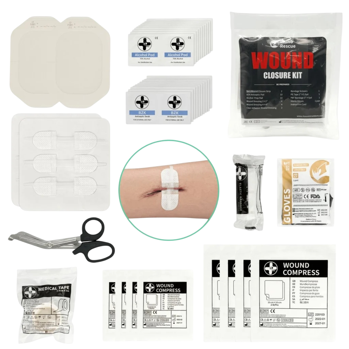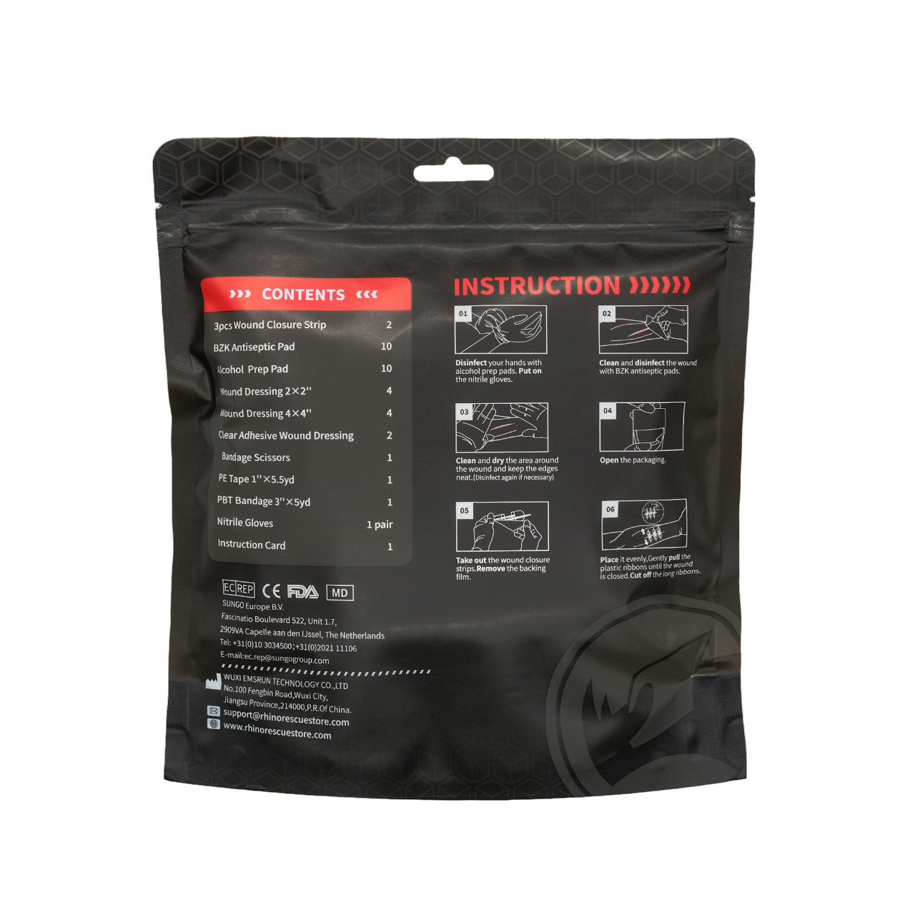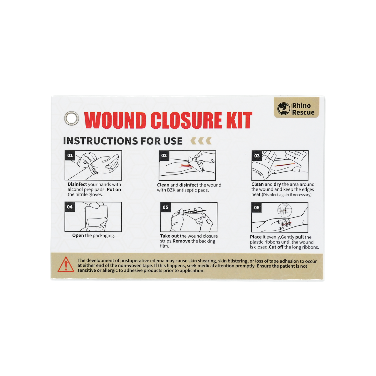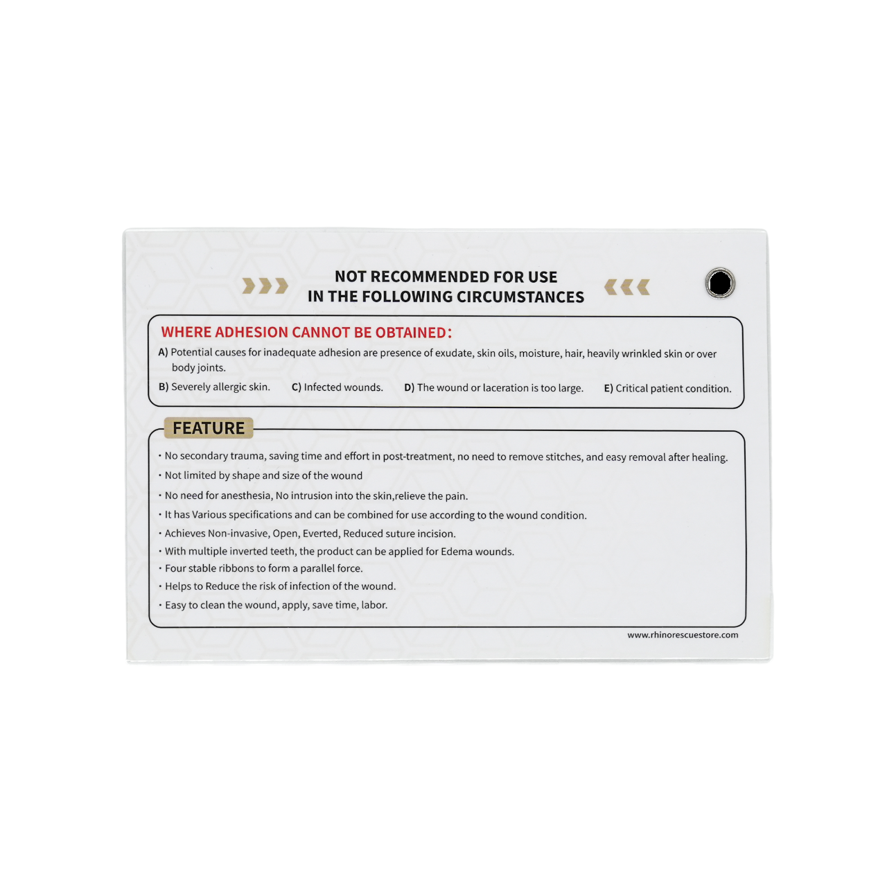 The Rhino Wound Kit is an innovative and practical wound care kit specifically designed for unexpected emergencies. This kit contains special wound closure strips that allow for quick and efficient initial wound care without the need for stitches. With its compact and portable size, this kit can be easily stored in a first aid kit, your vehicle's glove compartment, or your pocket , ensuring it's always ready when needed.
