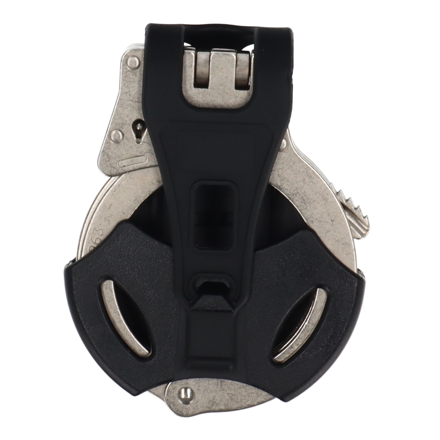 The natural, short downward pull quickly releases the safety catch, so that the handcuffs are ready for use in the closing hand. Pulling the hand back grips the handcuffs and ensures quick access.Universal compatibility