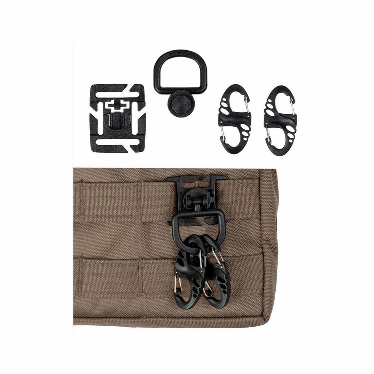 In addition to the carabiners, the set contains 2 Duraflex D-ring attachments that can be attached to MOLLE loops, thus offering a versatile attachment option . The D-ring can be rotated 360° and can be easily removed from the attachment using a click fastener, which is particularly advantageous for quick use.