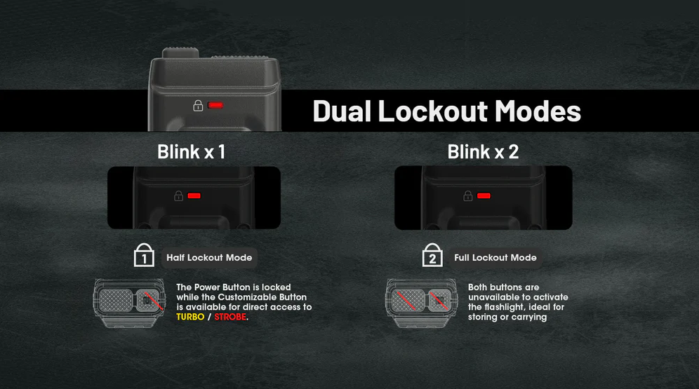 Additional functions : Two locking modes (Half and Full Lockout), access to Turbo or Strobe in Half Lockout