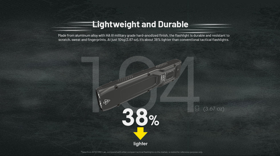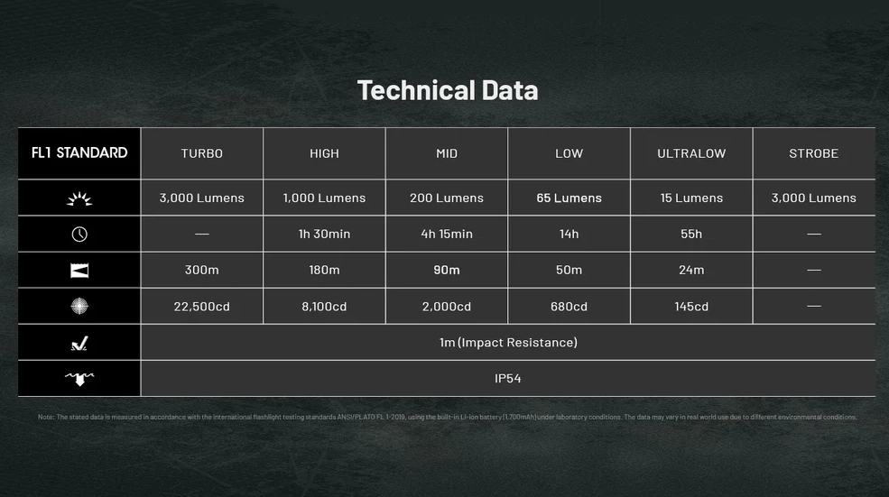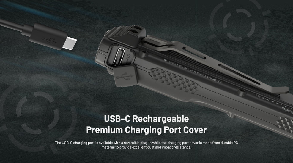 The EDC25 can be charged via the USB-C port. Power indicators display the battery level. When fully charged, the EDC25 can guarantee up to 55 hours of continuous use on the lowest setting and can be fully charged in just over an hour. The EDC25 features two locking modes: partial locking and full locking. Partial locking mode still allows you to access turbo or strobe modes, while full locking completely prevents any accidental activation. With a compact size of 13.6 cm and a weight of just 104 grams, the EDC25 fits easily into any pocket. It is also water-resistant according to the IP54 rating and has a drop resistance of 1 meter, ensuring reliable performance in any environment.