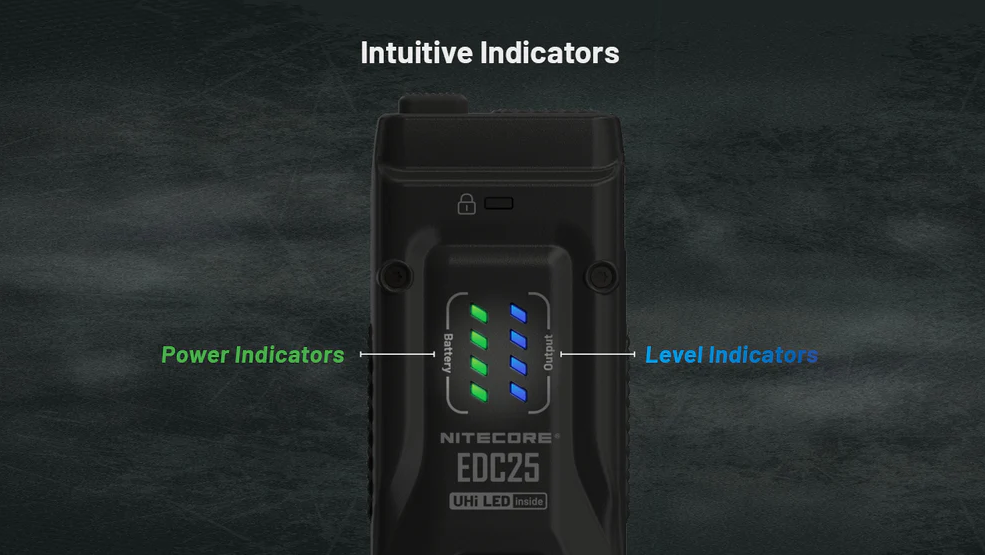 To turn the flashlight on or off, simply press the power button. When on, half-pressing the button allows you to cycle through four different brightness levels, indicated by the light indicators on the flashlight. When off, the EDC25 remembers the last brightness level used and recalls it the next time it is turned on. Quick access to Ultralow mode is possible by half-pressing the power button when off. The EDC25 has a programmable function that allows you to choose between Turbo or Strobe mode when you press the programmable button. To select the desired output mode, press and hold the programmable button and, without releasing it, fully press the power button to cycle between modes. Once set, the flashlight quickly accesses your preferred mode as soon as you press the programmable button.