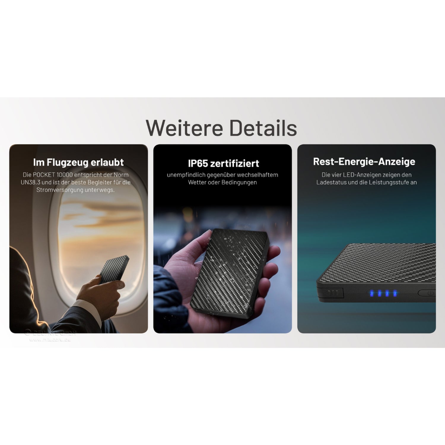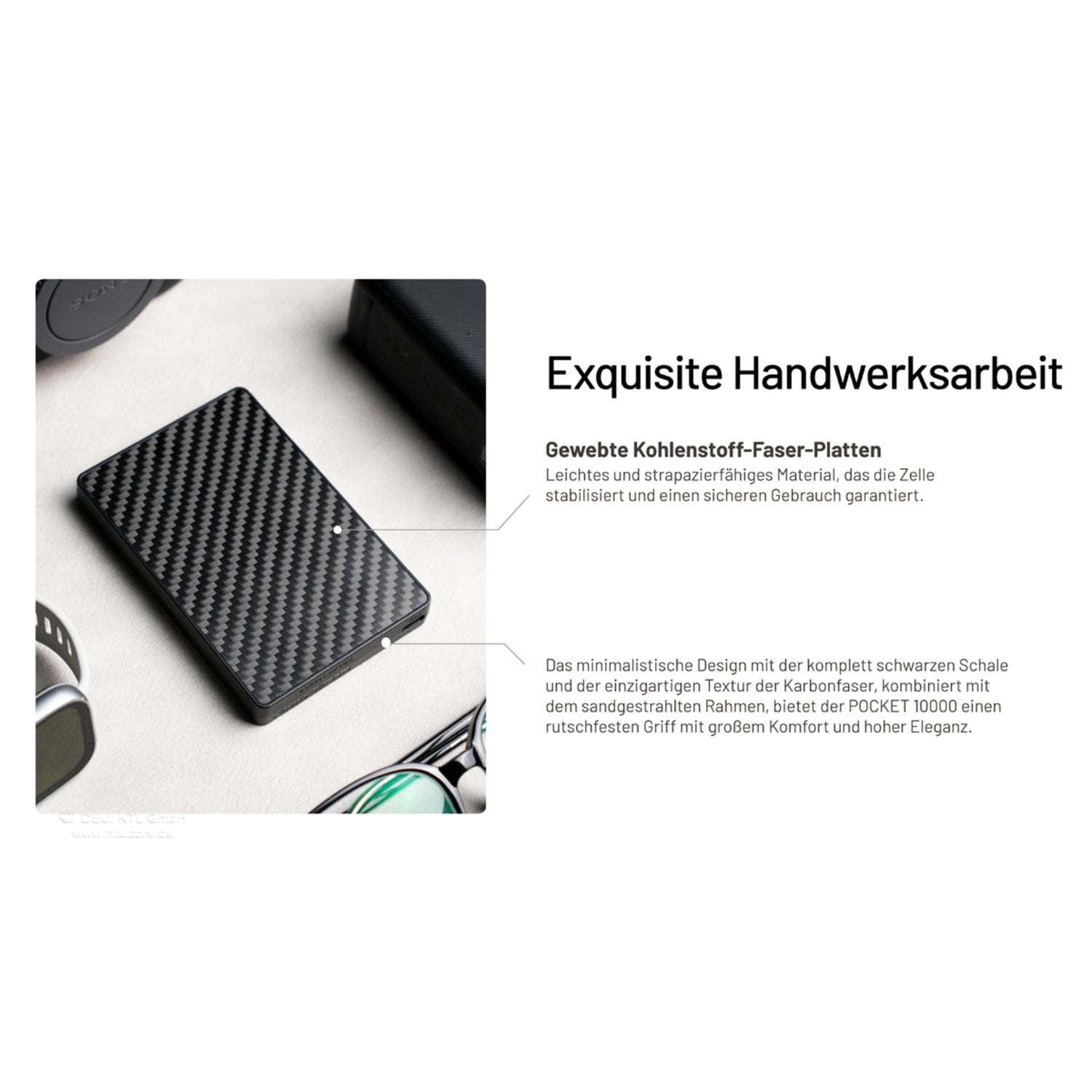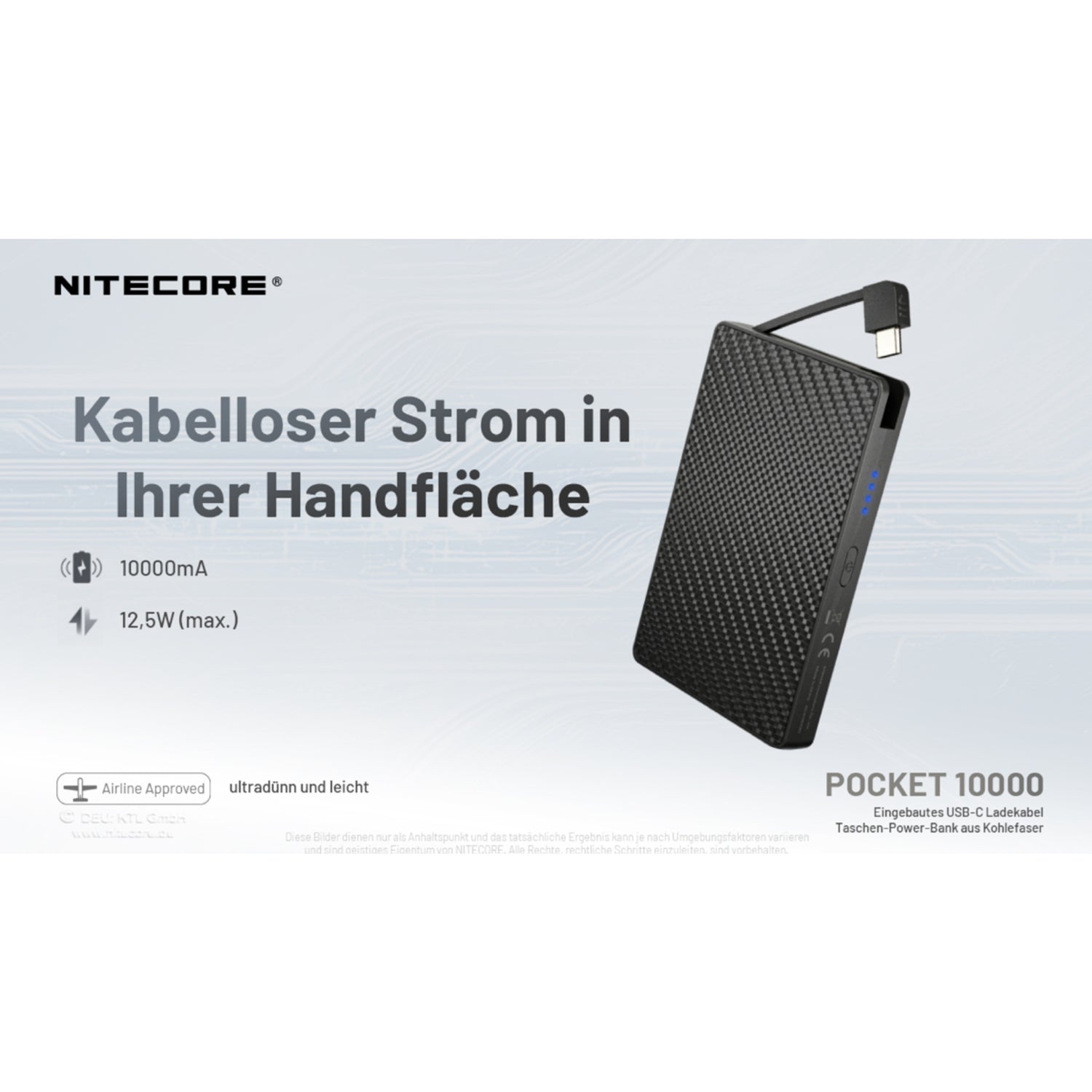 The Nitecore Powerbank POCKET10000 - 10000mAh is a compact and lightweight power bank specifically designed for professional use. With a capacity of 10000mAh and a permanently attached, flexible USB-C charging cable, it's always ready for use. The carbon casing ensures a low weight of only 160g and makes the power bank particularly durable.