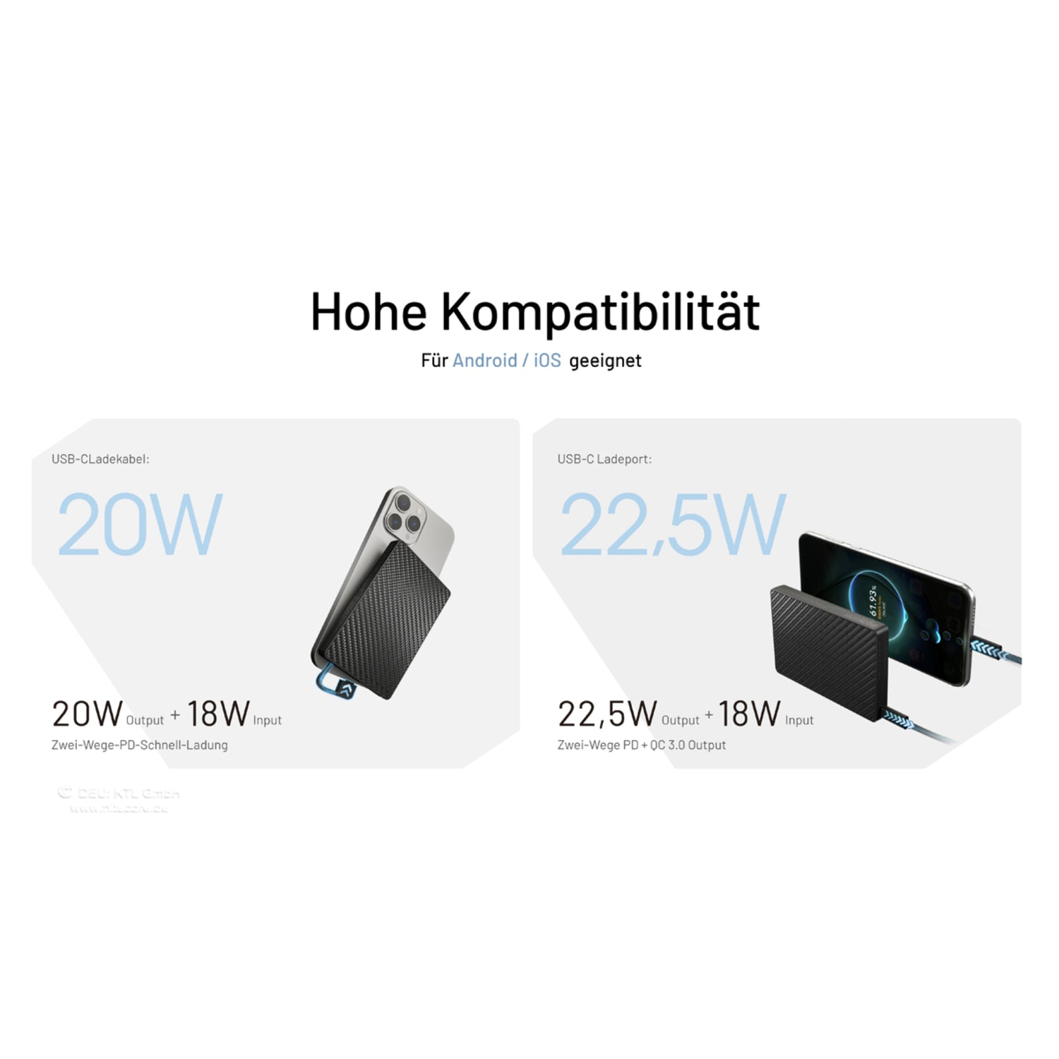 The power bank features a capacity indicator and is protected against overcharging, short circuits, deep discharge, overvoltage, and overheating . It is splash-proof according to IP65, making it ideal for outdoor use.